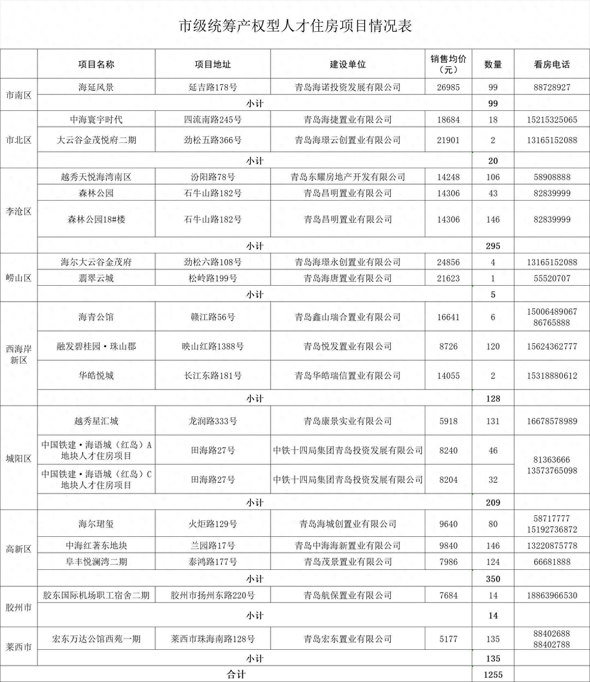 情况表中包括市南区1个项目、市北区2个项目、李沧区3个项目、崂山区2个项目、西海岸新区3个项目、城阳区3个项目、高新区3个项目、胶州市1个项目、莱西市1个项目。名单中既有这些在售产权型人才住房项目的名称、具体地址,也包含建设单位、销售均价、数量以及看房电话。(信网记者)